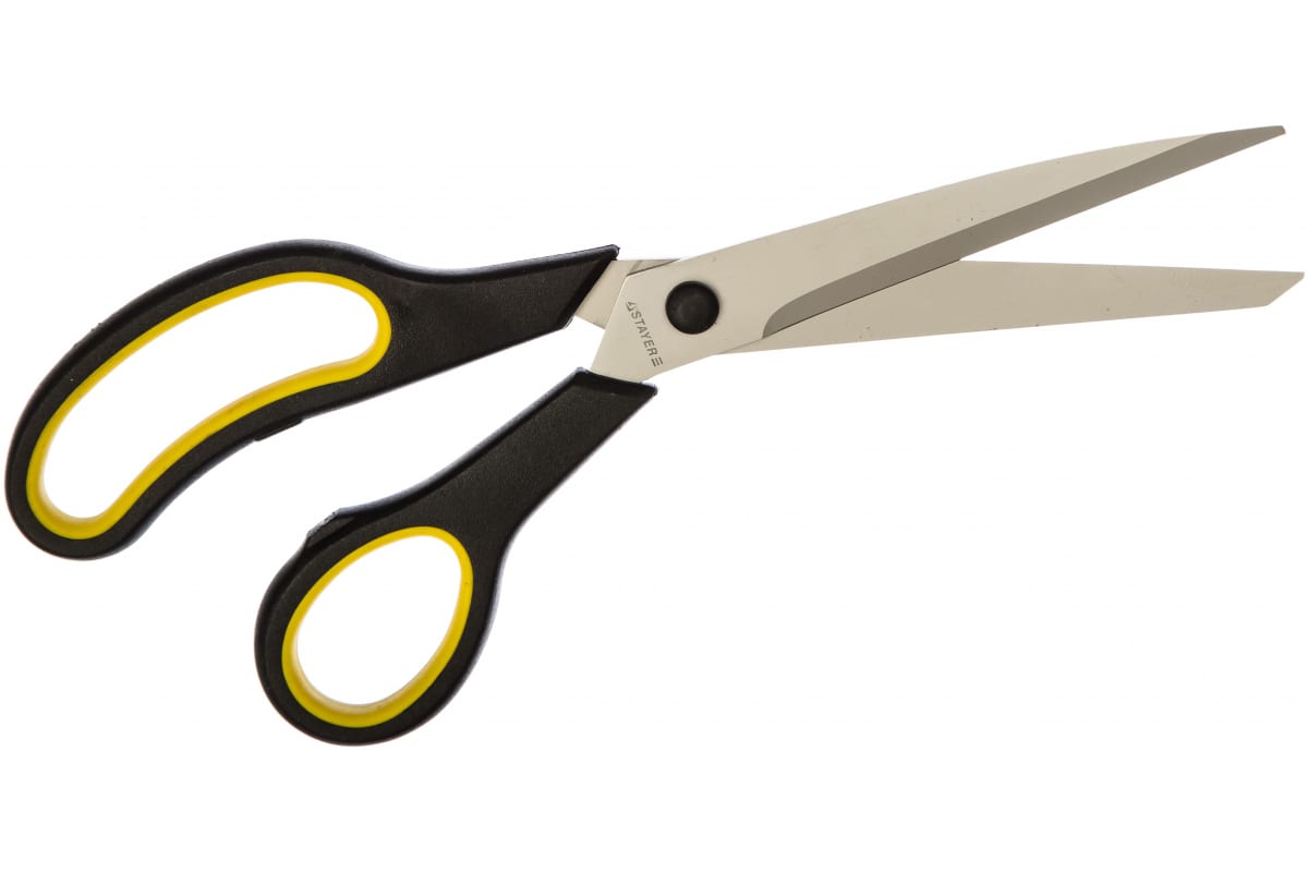 Хозяйственные ножницы, 245мм STAYER MASTER 40466-24 применяется для разрезания тканей, картона или бумаги. Лезвия изготовлены из нержавеющей стали, заточены и закалены. Эргономичные двухкомпонентные рукоятки из ударопрочного пластика имеют мягкие резиновые вставки, которые обеспечивают надежный захват и исключают скольжение. Изогнутая форма ножниц позволяет работать под наклоном и в труднодоступных местах.