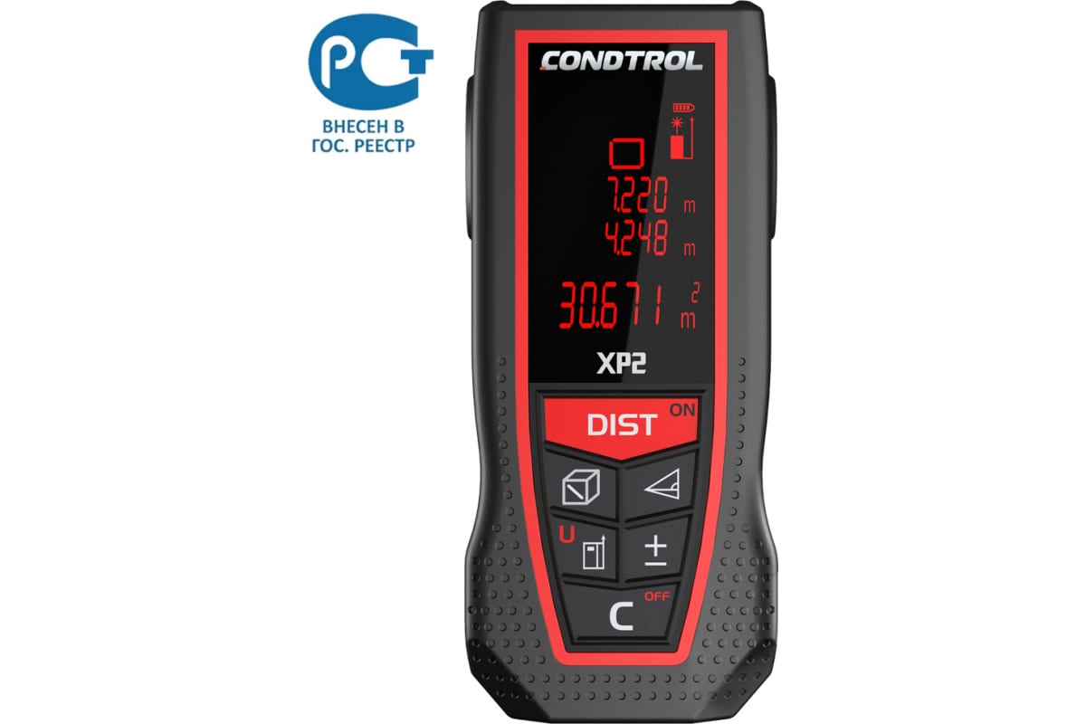 Лазерный дальномер Condtrol XP2 1-4-080 имеет понятный интерфейс и крупный трехстрочный дисплей с подсветкой. В режиме "трекинг" устройство постоянно измеряет дистанцию. При бездействии прибор автоматически отключается через 180 секунд, что значительно экономит заряд батарей. Благодаря крупным кнопкам, можно работать даже в перчатках. Модель имеет защиту от брызг воды и пыли IP54.