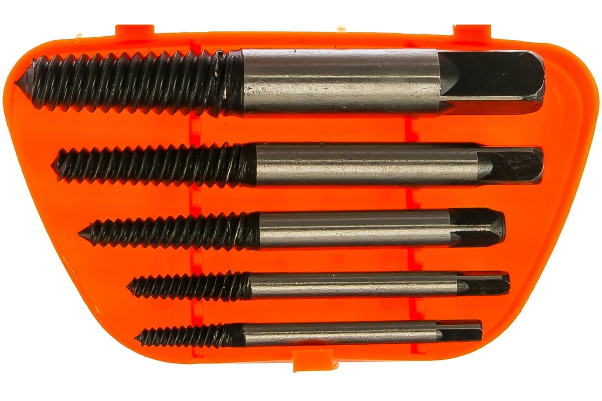 Набор экстракторов Sparta 773505, 5 шт., поможет извлечь застрявшие сломанные болты и шпильки с правой резьбой. Он обеспечивает эффективный результат при решении задач любой сложности. Набор пригодится строителям, автомеханикам и ремонтниками при проведении бытовых работ. Преимущества: Экстракторы из конструкционной углеродистой стали 45 отличаются прочностью, надежностью и долговечностью.Винтовые спиральные экстракторы не вбиваются как обычные, а вкручиваются, что позволяет вывернуть крепеж вне зависимости от степени поломки.Набор поставляется в пластиковом боксе, его удобно транспортировать и хранить, а содержимое при этом не потеряется.