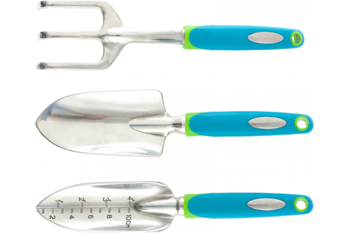 Набор садового инструмента Palisad LUXE 62902 включает 3 предмета с алюминиевым цельнолитым корпусом — рыхлитель и 2 совка. Узкий и широкий совки успешно справляются с вскапыванием грунта, формированием лунок и бороздок под посадку растений. Рыхлитель с заостренными зубьями осуществляет качественную аэрацию почвы, поскольку легко разбивает комья земли и проникает в грунт. Инструменты изготовлены из алюминиевого сплава, устойчивого к коррозии, поэтому прослужат долго. Набор пригодится для ухода за растительностью на клумбах, грядках, в парниках и теплицах. Преимущества: Надежность — инструменты имеют цельнолитую конструкцию и рабочие части с утолщенными стенками.Контроль глубины погружения в почву — на полотно узкого совка нанесена мерная шкала.Эргономичность — рукоятки с покрытием из термопластичной резины не выскальзывают из руки.Удобное хранение — в рукоятках имеются отверстия для подвешивания инструментов.