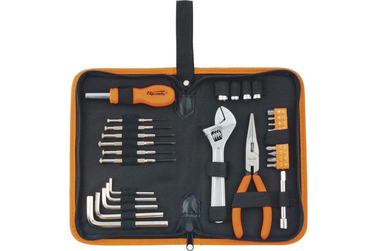 Набор Sparta 13535 состоит из 29 предметов, предназначенных для проведения слесарно-монтажных работ. Подходит для применения в бытовых условиях, в гараже и небольшой мастерской. Входящие в набор биты и торцевые головки, ключи-шестигранники, часовые отвертки, длинногубцы, переходник, удлинитель и разводной ключ позволяют работать с крепежом, имеющим стандартную и мелкую резьбу, в том числе в труднодоступных местах. Преимущества: Комплектующие набора выполнены из инструментальной стали и закалены, что придает им необходимую прочность и твердость.Отвертка и длинногубцы имеют пластиковые рукоятки для удобства захвата.Компактный тканевый пенал на молнии обеспечивает удобство и безопасность транспортировки/хранения набора.