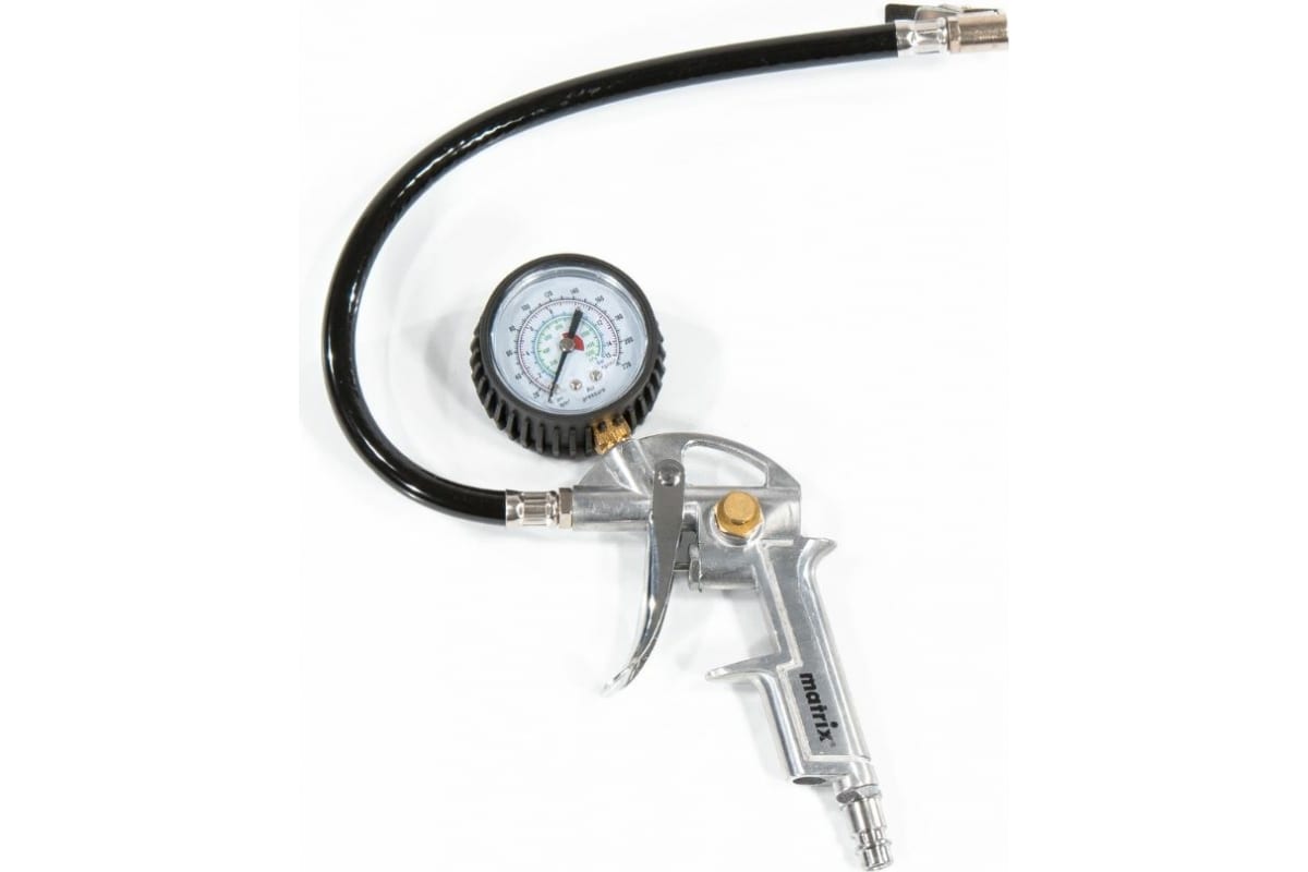 Пневматический пистолет Matrix 57322 с рабочим давлением 8 бар и производительностью 230 л/мин применяется для подкачивания автомобильных шин сжатым воздухом. Подходит для использования в гаражах, шиномонтажных мастерских и автосервисах. Манометр обеспечивает визуальный контроль давления, а спускной клапан позволяет стравливать воздух в случае перекачки шин, защищая их от преждевременного износа. Преимущества: Долговечность — прочный корпус и герметичные соединения обеспечивают эффективную работу в течение длительного времени.Контроль параметров работы — 2 шкалы на манометре (Пси и Бар) позволяют отслеживать и регулировать давление в шинах.Простое управление — при помощи удобного рычага подавать воздух в шины можно как быстро, так и дозированно.Гибкий шланг — он не твердеет на морозе, облегчает работу в труднодоступных местах и подкачку спаренных колес.Легкая подготовка к работе — быстросъемное соединение Рапид (Euro) упрощает подключение пневмопистолета к компрессору.Комфортное использование — пневмопистолет