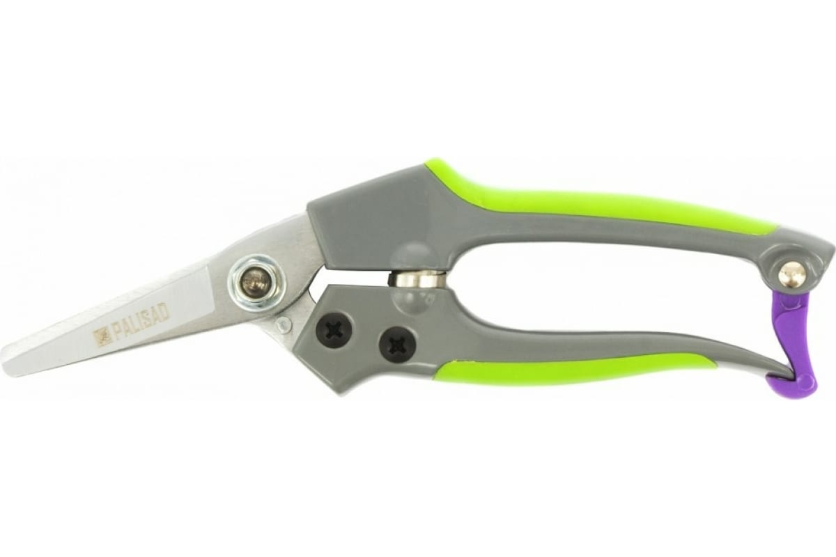 Цветочный секатор Palisad 60491 длиной 180 мм, с металлическими обрезиненными рукоятками, будет полезен дома, на даче, в саду и огороде. При помощи расположенных в параллельных плоскостях лезвий быстро и аккуратно срезает молодые побеги и стебли толщиной до 10 мм. Подходит для оформления крон бонсай и создания топиариев. Пригодится также в домашнем хозяйстве — им удобно резать картон, бумагу, ткань, подвязочный материал. Режущие кромки с прецизионной заточкой обеспечивают легкость реза, плотность смыкания лезвий регулируется при помощи крепежного винта. Преимущества: Прочность и износостойкость — лезвия из высокоуглеродистой стали, прошедшие индукционную закалку, устойчивы к истиранию. Долговечность — хромированные рабочие поверхности защищены от коррозии. Надежность — литые алюминиевые рукоятки выдерживают значительные нагрузки. Безопасное хранение и транспортировка — фиксатор надежно удерживает лезвия в нерабочем положении. Комфортное использование — рукоятки со вставками из термопластичной резины удобно ло