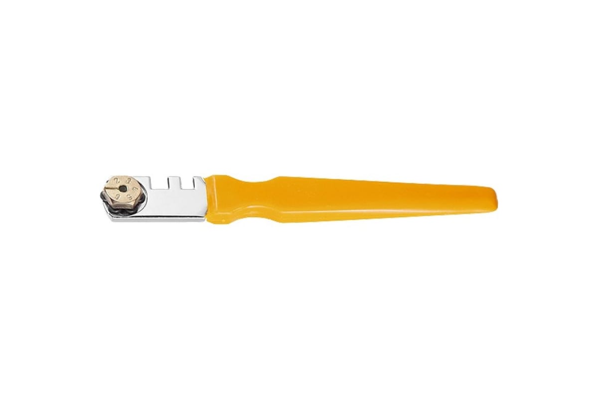 Шестироликовый стеклорез Sparta 872205 с пластмассовой рукояткой служит для резки стекла толщиной до 6 мм и подходит для бытового использования. С его помощью можно изготовить столешницу, полочку, заменить стекло в аквариуме или двери. Блок с 6 роликами позволяет быстро установить новый режущий элемент взамен изношенного — достаточно ослабить винт и повернуть головку. На головке имеются пазы шириной 4 и 5 мм для отламывания кромки стекла, увеличивающие функциональность стеклореза. Преимущества: Износостойкость — ролики из твердого сплава YG6 долго сохраняют режущую способность. Надежность — благодаря рукоятке из ударопрочной пластмассы и металлической головке конструкция устойчива к слому. Комфортная работа без лишних усилий — рабочий элемент легко движется по поверхности стекла. Эргономичность — пластиковая рукоятка удобно ложится в руку.