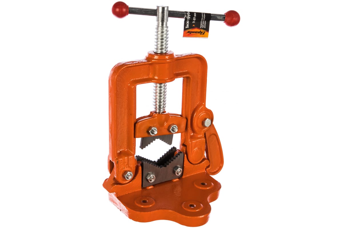 Трубные тиски Sparta 185705 с рабочим ходом 10-89 мм применяются для фиксации труб и других круглых заготовок. Они просты в использовании: механизм зажима опускается сверху вниз и фиксируется специальным крюком. С помощью инструмента можно распиливать трубы, нарезать резьбу и выполнить другие слесарные работы. Преимущества: Конструкционная прочность — губки и корпус тисков изготовлены из чугуна.Защита от коррозии — на инструмент нанесено эмалевое покрытие.Болтовой тип крепления — тиски можно использовать в качестве стационарного инструмента.Удобство использования зажимного механизма — на рукоятке имеются пластиковые наконечники.Небольшой вес 4,82 кг — инструмент удобно транспортировать и брать с собой на выездные работы.