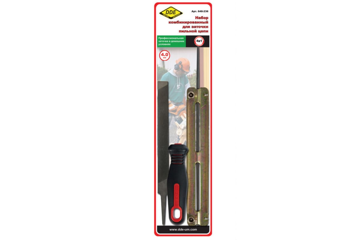 Заточной набор комбинированный DDE 648-236 включает в себя все необходимое для профессиональной заточки цепи бензопилы, не снимая ее с самой пилы. Данный набор подходит для заточки цепи с шагом 1/4", 3/8 PMN, 3/8 P. Заточной набор включает в себя плоский напильник для стачивания ограничителя глубины, круглый напильник, ручка для напильника, державка для круглого и плоского напильников.